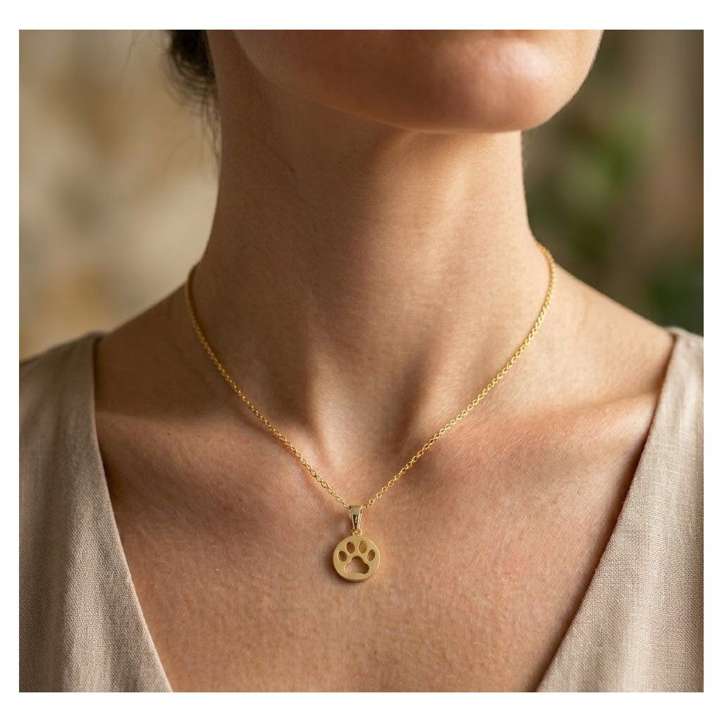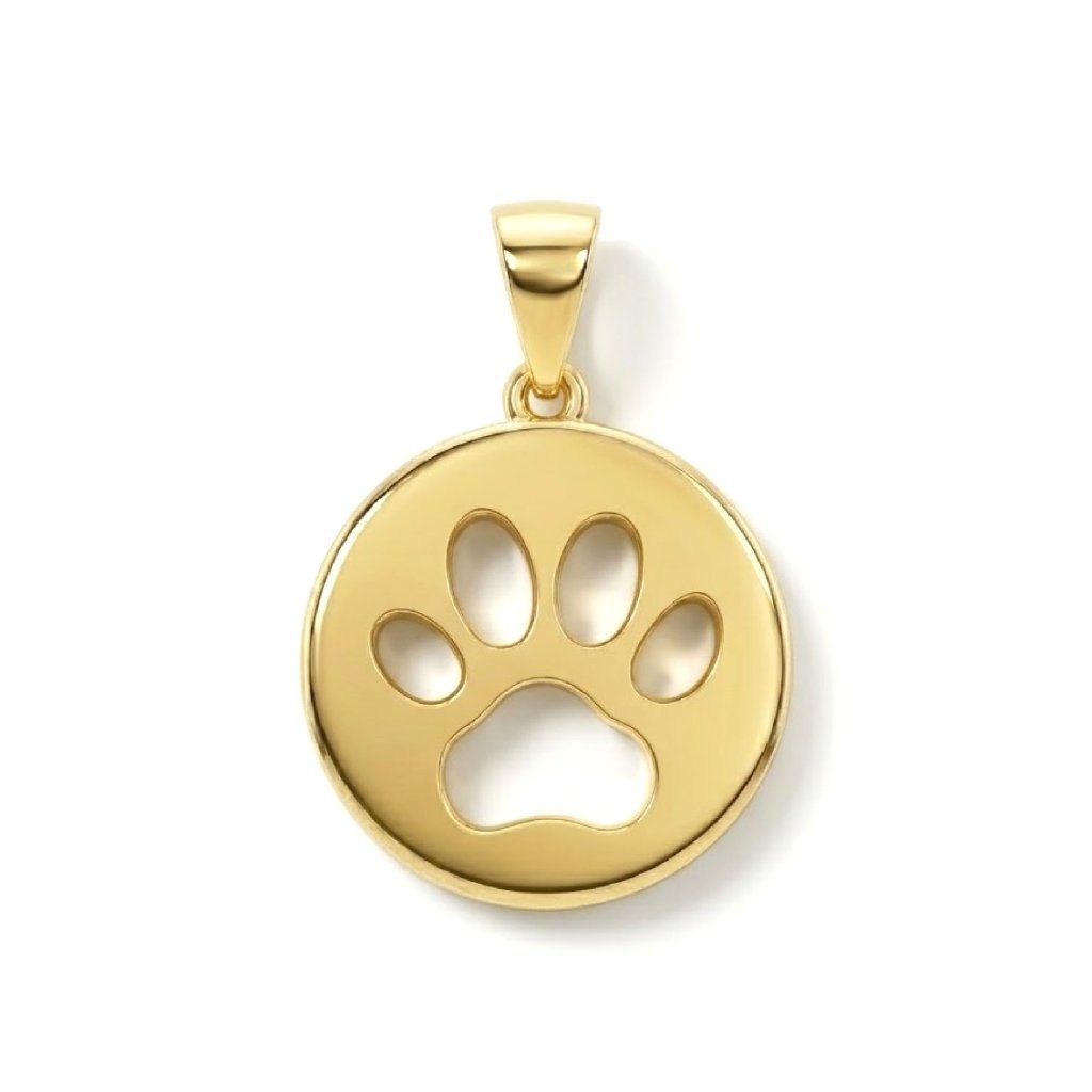 Zlatý prívesok v tvare kruhu s výrezom psej labky, vhodný na gravírovanie mena vášho psíka.