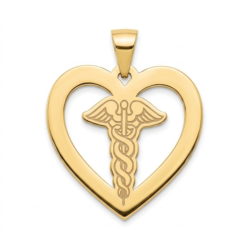 Zlatý prívesok v tvare srdca s zdravotníckym symbolom.